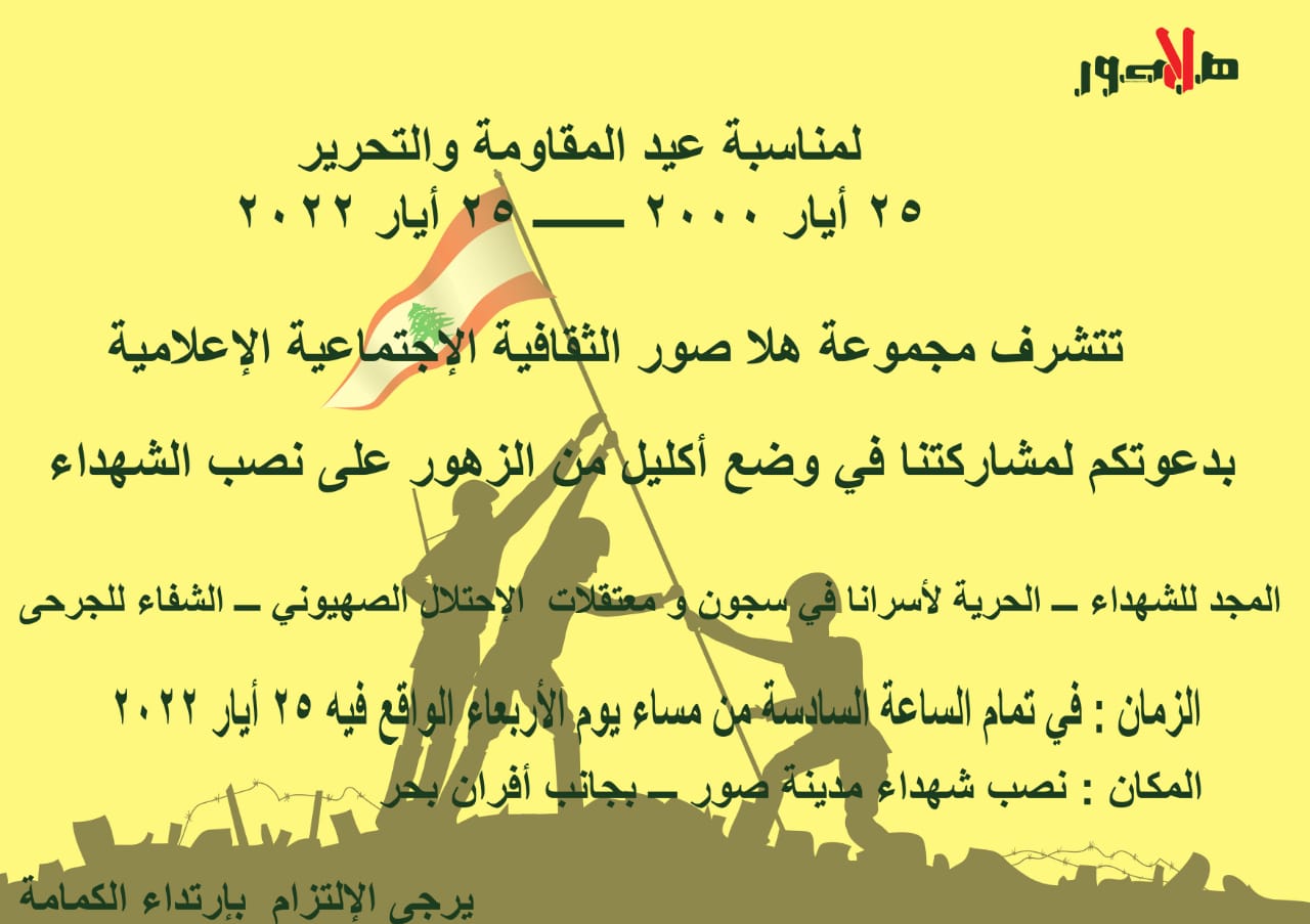 الرئيسية/دعوة للمشاركة في حفل عيد المقاومة والتحرير 2022 في صور \ مجموعة هلا صور الثقافية الاعلامية/WhatsApp Image 2022-05-20 at 2.45.20 PM WhatsApp Image 2022-05-20 at 2.45.20 PM Share on: WhatsApp
