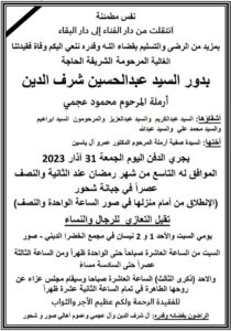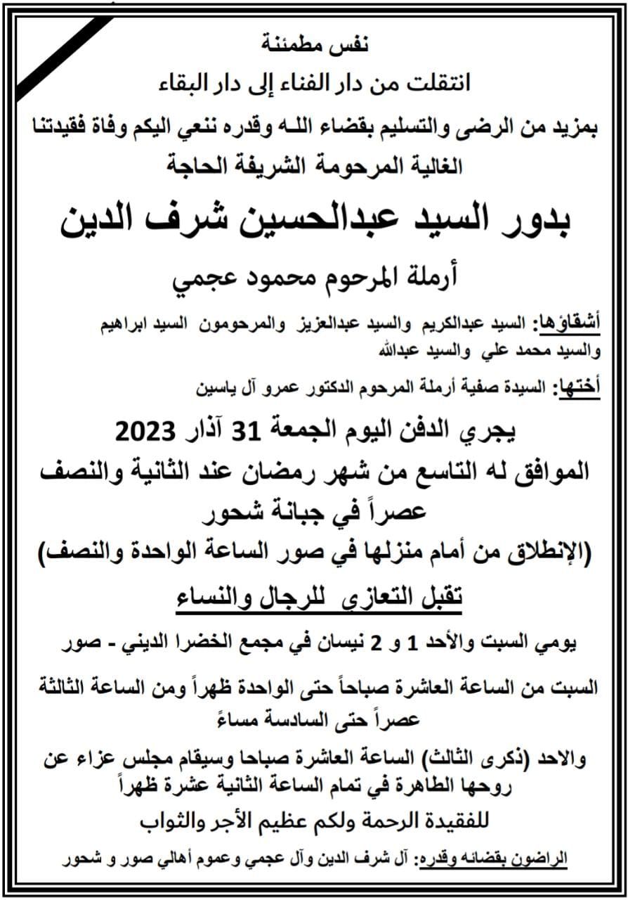 الرئيسية/وفاة الشريفة الحاجة بدور شرف الدين شقيقة مؤسس اذاعة صوت الفرح السيد عبد العزيز شرف الدين/IMG-20230330-WA0678 IMG-20230330-WA0678 Share on: WhatsApp