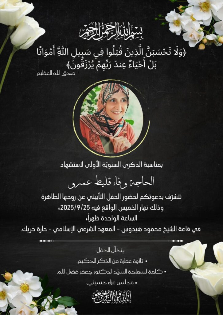 في الذّكرى الأولى لاستشهادكِ، أرفع يدي إلى السّماء، وأسأل الله أن يجعل ما عانيتِه في ميزان حسناتكِ، وأن يُضيء قبركِ كما أضأتِ حياتي، وأن يجعل الفردوس الأعلى مستقرّكِ ومأواكِ.