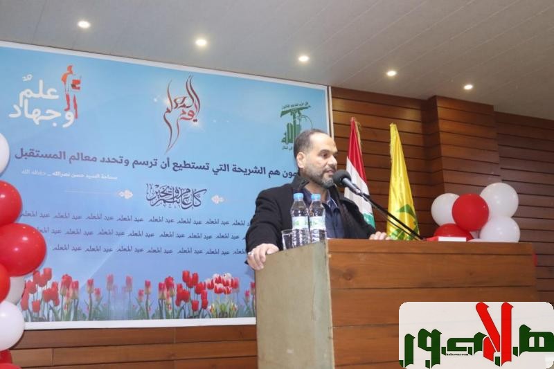 من اجواء الاحتفال التكريمي الذي اقامه حزب الله لمناسبة عيد المعلم مع رئيس مركز باحث للدراسات البروفيسور يوسف نصرالله في بلدة القليله .