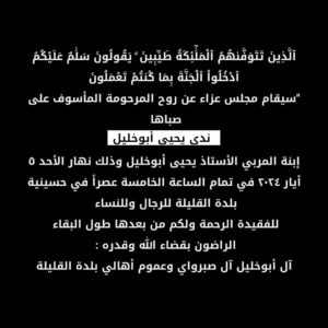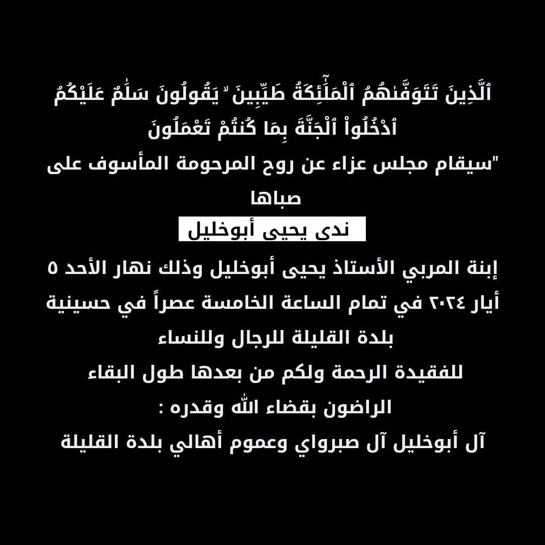 الرئيسية/مجلس عزاء عن روح المرحومة المأسوف على صباها ندى يحيى ابو خليل/صورة واتساب بتاريخ 1445-10-26 في 22.30.37_a17d35c2 صورة واتساب بتاريخ 1445-10-26 في 22.30.37_a17d35c2