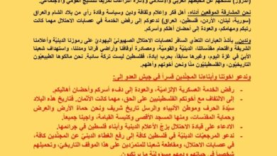 بيان من ملتقى رفض خدمة العسكرية الالزامية لاخوتنا وابنائنا في فلسطين في عصابات الاحتلال اليهودي الصهيوني .. نأمل تعميمه وممن يرغب بتوقيعه إرسال الاسم الكامل والبلد
