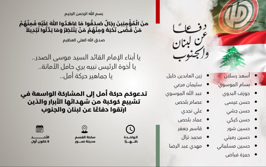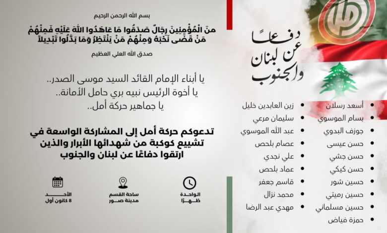 الى جماهير حركة أمل أنتم مدعوون إلى المشاركة الواسعة في تشييع كوكبة من الشهداء الأبرار الذين ارتقوا#دفاعًا_عن_لبنان_والجنوب مدينة صور – ساحة القسم
