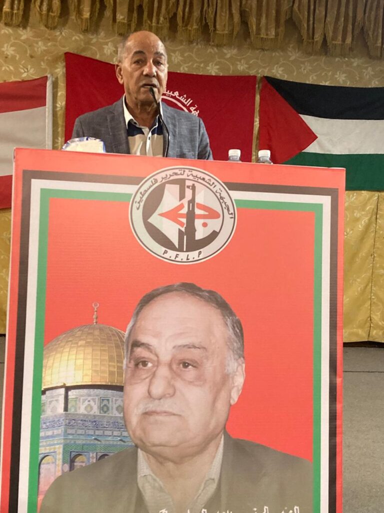وألقى مسؤول المكتب الإعلامي للجبهة الشعبية، وعضو قيادتها في لبنان احمد مراد . كلمة استهلها بتوجيه تحية إجلال وإكبار لروح الشهيد القائد أبو أحمد فؤاد ، ولكل الشهداء الذين ارتقوا على درب الحرية، مستعرضاً بعضاً من مزاياه وسيرته النضالية منذ أن أبصر النور عام 1942 في قرية سلوان الواقعة عند أسوار مدينة القدس والمتاخمة للحرم القدسي الشريف، والذي تفتح وعيه على النكبة التي حلت بالشعب الفلسطيني عام 1948، فآمن بالمقاومة سبيلاً لإستعادة الكرامة والحق المغتصب. فالتحق مبكراً في صفوف حركة القوميين العرب ، ولاحقاً في الجبهة الشعبية لتحرير فلسطين، التي وجد فيها الوسيلة الكفيلة بتحقيق طموحات وأهداف شعبه. وخلال تلك المسيرة النضالية الطويلة، تنقل ألشهيد الكبير بين العديد من المهام والمسؤوليات، فقاد وخطط العديد من العمليات العسكرية النوعية ضد قوات الإحتلال ومستوطنيه، الأمر الذي اعاد للقضية الفلسطينية وهجها ، وألحقت بالعدو الخسائر الفادحة، وأثبتت أن الحق لا يسقط بالتقادم، فلا يضيع حق وراءه مطالب. وخلال مسيرته تعرض للملاحقة والإعتقال ، وكان له دور بارز أثناء معارك أيلول الأسود عام 1970، لينتقل بعدها إلى لبنان ليساهم في بناء القواعد العسكرية الأولى للجبهة والثورة في جنوب لبنان، والتي كانت منطلقاً للعديد من العمليات العسكرية ضد الكيان. ويسجل له دور بارز في التصدي للعدوان الصهيوني على لبنان واجتياحاته المتكررة عامي 1978 و1982، ومساهماته النوعية في قيادة وتخطيط عمليات الجبهة العسكرية ضد قوات الاحتلال الصهيوني في بيروت والجبل وجنوب لبنان والبقاع الغربي، في إطار جبهة المقاومة الوطنية اللبنانية. لينتقل بعدها إلى سوريا ويتسلم لاحقاً مسؤولية الدائرة السياسية للجبهة، وينتخب نائباً للأمين العام حتى انعقاد المؤتمر الثامن للجبهة، حيث أبدى التزاماً تنظيمياً طوعياً وصادقاً، وبما ينسجم مع مبادئه وقناعاته الثورية، متخلياً مع عدد من رفاقه في المكتب السياسي عن مواقعهم القيادية، لإفساح المجال أمام الأجيال الشابة لقيادة مسيرة الجبهة والثورة نحو التحرير والنصر. وليتولى مسؤولية مكتب العلاقات العربية في الجبهة حتى تاريخ إستشهاده .