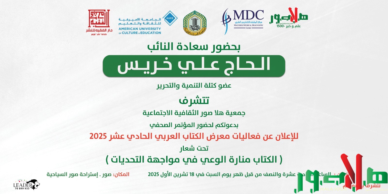 عقد مؤتمر صحفي حاشد لهلا صور في استراحة صور السياحية للاعلان عن اطلاق فعاليات معرض الكتاب العربي الحادي عشر الذي ستقيمه جمعية هلا صور في مركز ابحار الثقافي بمجمع باسل الأسد في مدينة صور يوم الخميس في 30 تشرين الجاري وقد تحدث فيه كل من عضو كتلة التنمية والتحرير النائب الحاج علي خريس والكاتب الدكتور عماد سعيد والمخرج الفنان علي كلش والأستاذ علي قاسم ممثلا سماحة العلامه السيد علي فضل الله والشاعرة زينب دياب حول أنشطة المعرض وما يتضمنه من فعاليات ثقافية واعلامية ومهرجان الشعر العربي وجناح فلسطين وجناح بلدتي ( البازورية ) وهلا صور واقلام عاملية وتكريمات وندوات ومحاضرات وتواقيع كتب