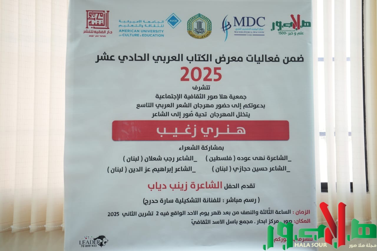 اقيم مهرجان الشعر العربي التاسع بعد ظهر اليوم بدعوة من جمعية هلا صور الثقافية الاجتماعية والكاتب الدكتور عماد سعيد وذلك في إطار معرض الكتاب العربي الحادي عشر الذي تقيمه هلا صور في مركز ابحار الثقافي بمجمع باسل الأسد في مدينة صور بجنوب لبنان٠ وقد شارك في المهرجان الشعراء حسين حجازي وإبراهيم عز الدين ود٠ رجب شعلان والشاعرة الفلسطينية نهى عودة ٠وقدمت للمهرجان مسؤولة مهرجان الشعر العربي الشاعرة زينب دياب وقد توزعت الأبيات الشعرية حول فلسطين والوجدان الخاص والعام بلغة جميلة تعبر عن هموم الوطن والذات