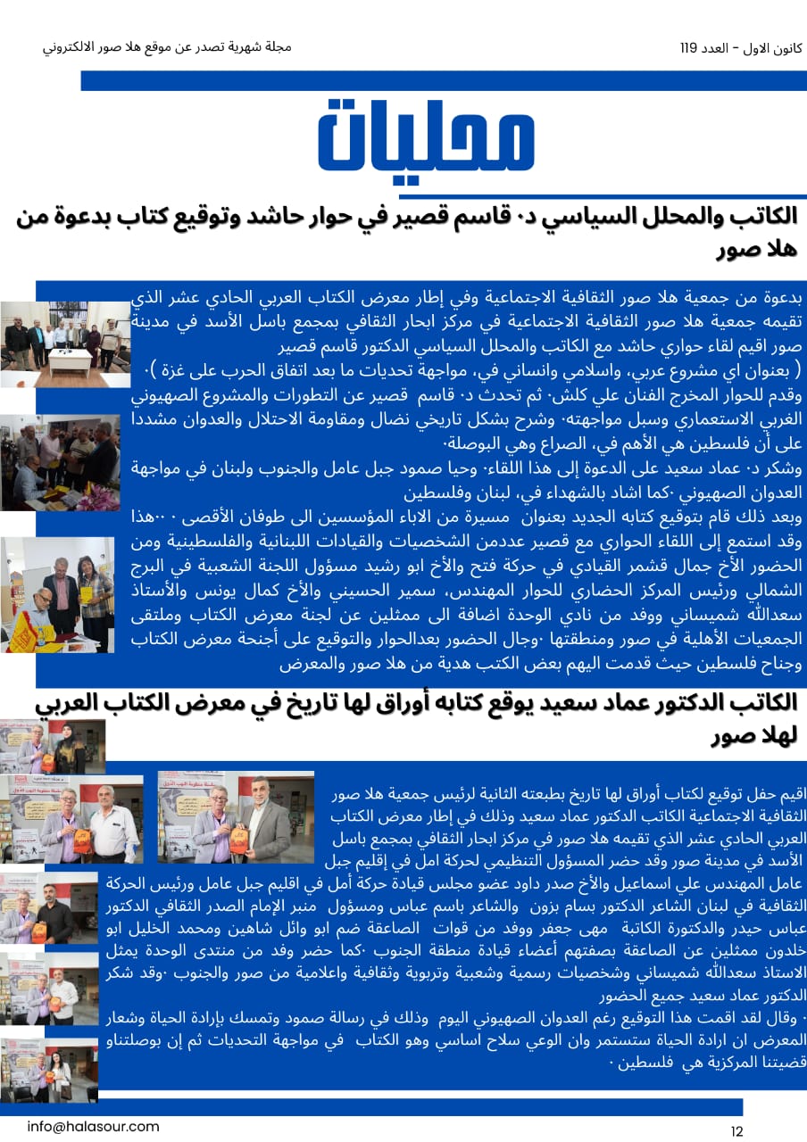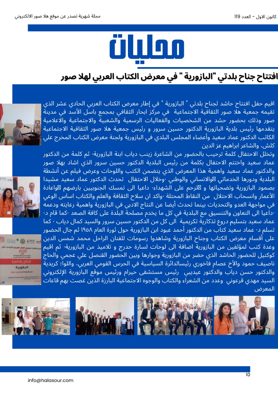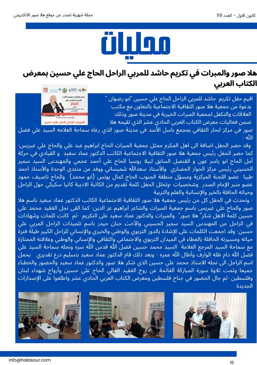 صدور العدد رقم 119 \ 2025 من مجلة هلا صور الورقية الشهرية المخصص لافتتاح معرض الكتاب العربي الحادي عشر برعاية وحضور سماحة العلامة السيد علي فضل الله