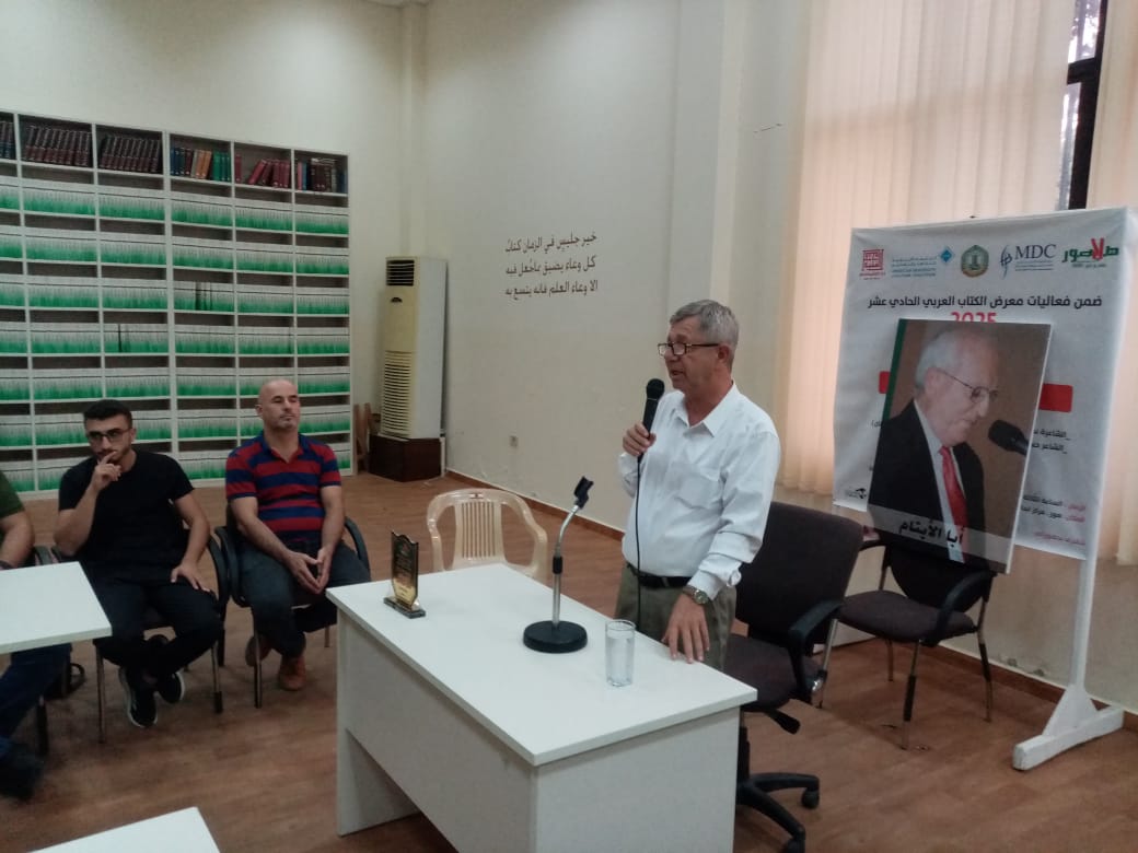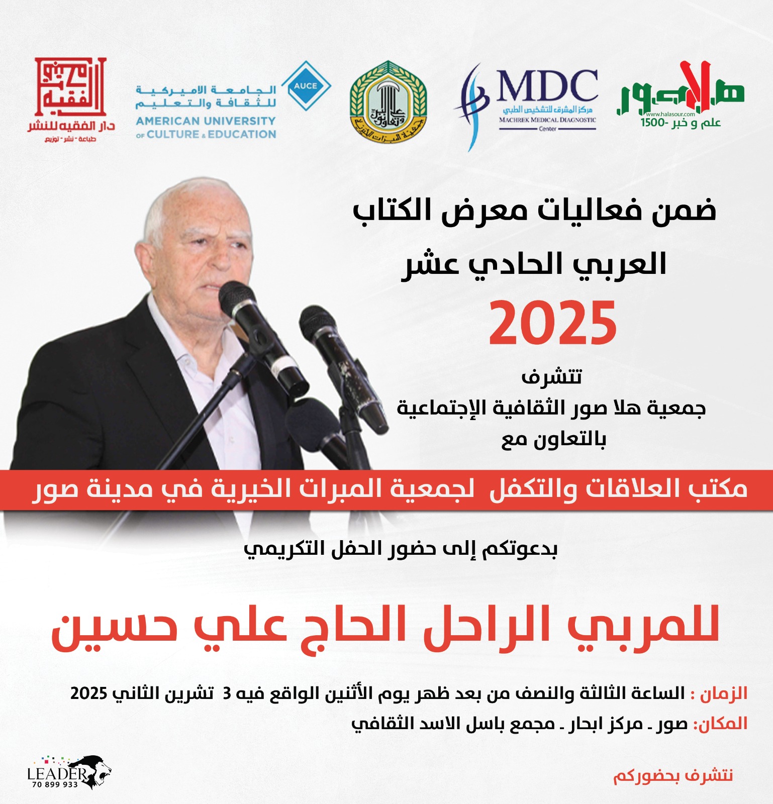 ٠ وتحدث في الحفل كل من رئيس جمعية هلا صور الثقافية الاجتماعية الكاتب الدكتور عماد سعيد باسم هلا صور والحاج علي غبريس باسم جمعية المبرات والشاعر ابراهيم عز الدين٠ كما القى نجل الفقيد محمد علي حسين كلمة الاهل شكر” هلا صور” والمبرات والدكتور عماد سعيد على التكريم ٠ثم كانت كلمات وشهادات في الراحل من المهندس السيد سمير الحسيني والأخت حنان حيدر باسم تلميذات الراحل المربي علي حسين٠ وقد اجمعت الكلمات على الإشادة بالدور التربوي والوطني والخيري والإنساني للراحل الكبير طيلة فترة حياته ومسيرته الحافلة بالعطاء في الميدان التربوي والاجتماعي والثقافي والإنساني والوطني وعلاقته الممتازة مع سماحة السيد المرجع العلامة السيد محمد حسين فضل الله قدس الله سره ونجله سماحة السيد علي فضل الله دام ظله الوارف وأطال الله عمره ٠ وبعد ذلك قام الدكتور عماد سعيد بتسليم درع تقديري يحمل اسم الراحل الى نجله الاستاذ محمد علي حسين الذي شكر هلا صور والدكتور عماد سعيد والحضور والخطباء جميعا وتمت تلاوة سورة المباركة الفاتحة عن روح الفقيد الغالي الحاج علي حسين وأرواح شهداء لبنان وفلسطين ٠ثم جال الحضور في جناح فلسطين ومعرض الكتاب العربي الحادي عشر واطلعوا على الإصدارات الجديدة ٠