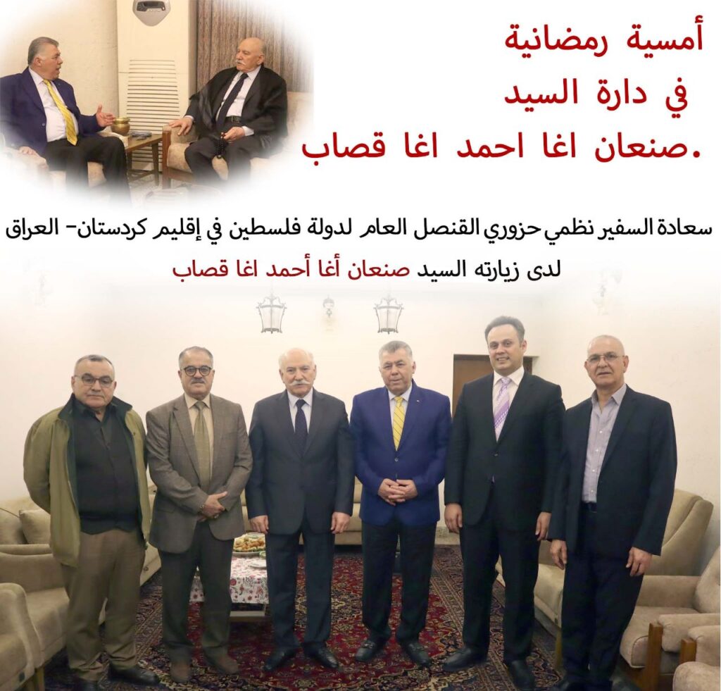 عبر سعادة السفير نظمي حزوري … القنصل العام لدولة فلسطين في إقليم كردستان- العراق عن التقدير والسعادة لدى زيارته السيد صنعان أغا أحمد اغا قصاب… في الأمسية الرمضانية مهنئا ومباركا بشهر رمضان المبارك والتقدير للسيد صنعان اغا قصاب والذي مثلت حياته ولمراحل هامة في العمل السياسي والمحاماة… ومع تقديره لعلاقة الأخوة والصداقة وفي الأمسية من الشهر المبارك كان لتجاذب الحديث والحوار حول محطات هامة … وكما سؤاله الدائم عن فلسطين… وضعه سعادة السفير نظمي حزوري … حول آخر المستجدات… ومن السعادة وكل الاحترام لمن شارك الحضور واغناء الامسية بمعاني الاخوة والمحبة… ومع التقدير للسيد صنعان وابناء عائلته الاستقبال الجميل ومعاني المحبة… كان لحضور الاعزاء الكرام د. عمر شيخ فاروق بزيني… ولشخصيات اعتبارية ومجتمعية اربيلية السيد زهير جاسم توتنجي ابو زينب… والسيد أزاد قهوجي…