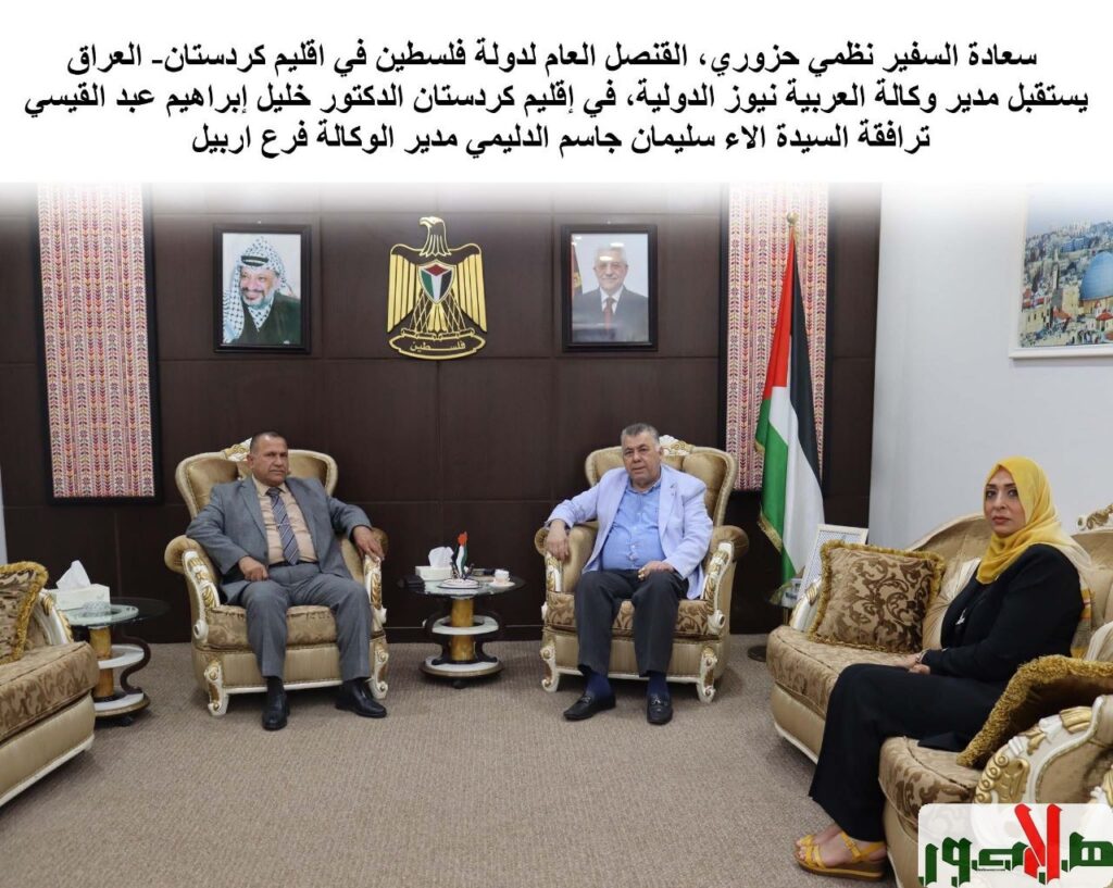 استقبلهم سعادة السفير نظمي حزوري، القنصل العام لدولة فلسطين في اقليم كردستان- العراق … مع الترحيب والتقدير للزيارة والتواصل المستمر… معتزا بدور ومواقف الدكتور خليل القيسي ومواقفه الثابتة دعما وسندا لنضال الشعب الفلسطيني وحقوقه الوطنية المشروعة… وبحضور السيدة الاء الدليمي مدير فرع اربيل لوكالة العربية نيوز الدولية… بتأكيد مشترك على حرص التعاون… وكما تناول اللقاء حوار هام حول اخر المستجدات ذات الشأن العربي وظروف المنطقة وفي اخر مستجدات الوضع الفلسطيني… ومشيرا سعادة السفير نظمي حزوري… على اهمية دور الاعلام وفي فضح سياسة الاحتلال الاسرائيلي… وبما تشكله من عدوان على السلام عدوان على الشعب الفلسطيني ويثبت يوميا من خلال ممارساته العنصرية… وسياسة التهويد والاستيطان شهادة عن عدوانيته ويكشف ان التطبيع المجاني يستخدمه لصالحه دون ان يقدم علامة فارقة بل مزيد من شهادات جرائم الاحتلال. … شكر سعادة السفير نظمي حزوري، الدكتور خليل القيسي والسيدة الاء الدليمي على مواقفهم وكما لأهمية الحوار الذي كان غنيا. ومفيدا لإغناء الرأي ووضوح الموقف ولأهمية دور الاعلام وتأثيره على الرأي العام وخاصة تجاه القضايا العادلة بالمقدمة القضية الفلسطينية. التي يعاني شعبها من اخر احتلال واستعمار في العالم٠٠٠٠٠٠٠٠٠٠٠٠٠٠٠٠٠٠برعاية وحضور محافظ اربيل السيد أوميد خوشناو