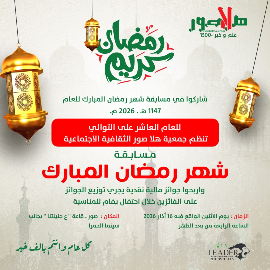أقامت جمعية هلا صور الثقافية الاجتماعية للعام الرابع على التوالي حفل توزيع الجوائز المالية النقدية على الفائزين بمسابقة شهر…